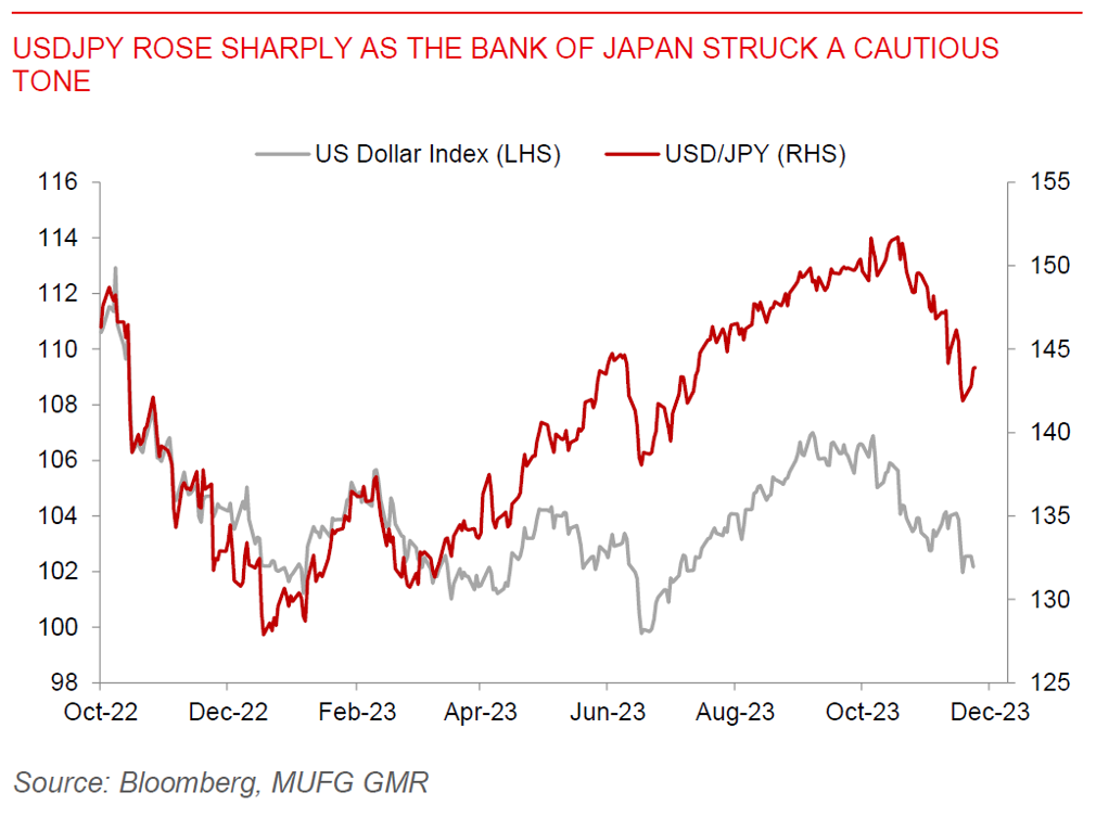 The BoJ held its short-term rate at -0.1% and kept its yield curve control parameters in a unanimous decision. It struck a cautious tone, as Ueda maintained that more evidence is needed to confirm that wage gains are feeding into sustainable inflation. The BoJ also signalled a relatively high bar to hiking in January.