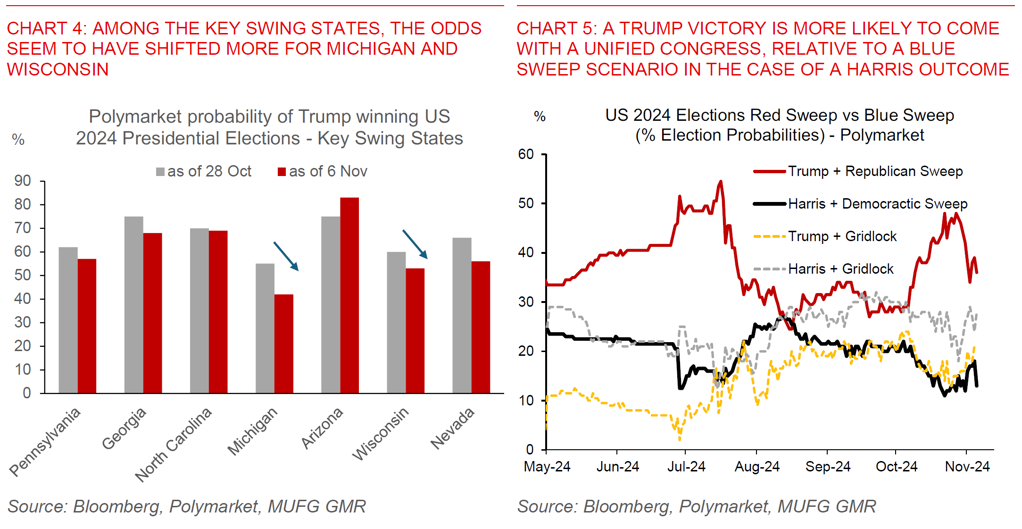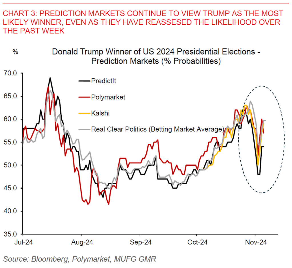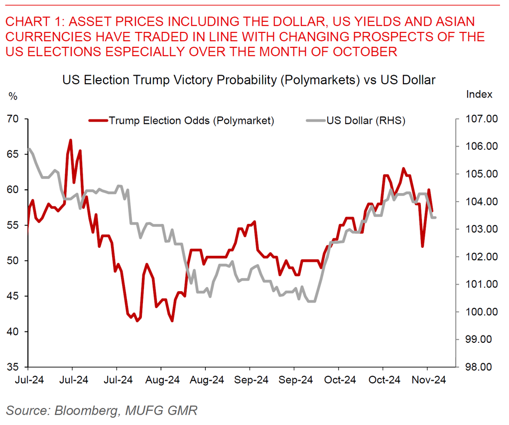 The 2024 US Presidential and Congressional Elections are happening now, with polls starting to close in some states as we write. Heading into the Elections, models based on polling surveys tell us that it is a coin-toss between Kamala Harris and Donald Trump, with a slight but narrowing edge in favour of Trump. Meanwhile, Prediction Markets are more unequivocal, at the moment placing between 54%-60% chance for Trump to win. This lead had nonetheless tightened quite meaningfully over the past week before bouncing back, perhaps accounting for better recent polling data for Harris. Regardless of one’s belief in Prediction Markets, what’s clear is that asset prices including the Dollar, Asian currencies, and US rates have traded in tandem with changing prospects of the US Elections especially in October. As the day progresses and as new information comes in during the Asia trading session and into London open, both Prediction Markets and asset prices will try to price for the changing outlook even before any races are officially called, leading to elevated volatility near-term.