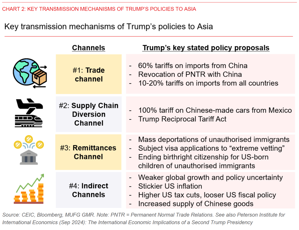 We expect further Dollar strength, higher US yields and weaker Asian currencies in a 2nd Trump Presidency. The gamut of Trump’s policies including tariffs and immigration rollbacks generally boosts inflation in the US with negative spillover impact for Asian economies. In our latest Global FX Monthly, we have laid out our scenario for the Dollar to be roughly 7-8% stronger in the event of a Trump Presidency, and relative to our baseline assumption of a Harris victory (see Nov 2024 Global FX Monthly). In addition, we think the Fed will likely slow its rate cutting cycle by around 100bps relative to our baseline. While there is some pricing of Trump in markets, this is likely more so in the US rates markets, and relatively less so in FX so far.