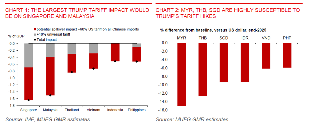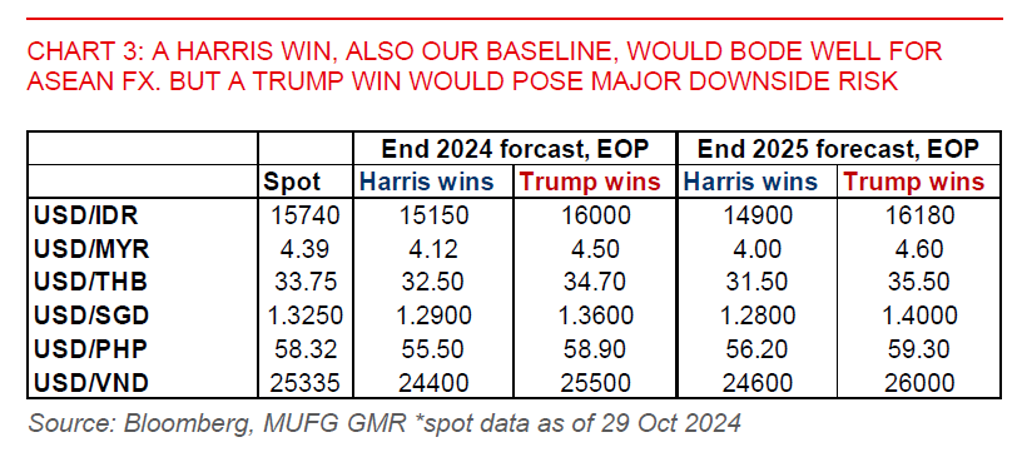 - A Trump scenario would lead to weaker ASEAN currencies against the US dollar. This will mainly be driven by the Fed keeping interest rates higher than our baseline expectation, given the inflationary consequences of his proposed economic policies (tariffs + wider fiscal deficits). Mapping our analysis of the potential impact of Trump’s tariff on ASEAN FX, we expect larger depreciatory pressure on MYR, THB, and SGD, given the larger tariff impact on them and lower yields versus the US in the case of MYR and THB. The rupiah would also be highly vulnerable in a sustained period of US dollar strength and elevated US rates. A hit to Vietnamese electronics exports would also hurt the VND. PHP would also be affected, but likely less so.