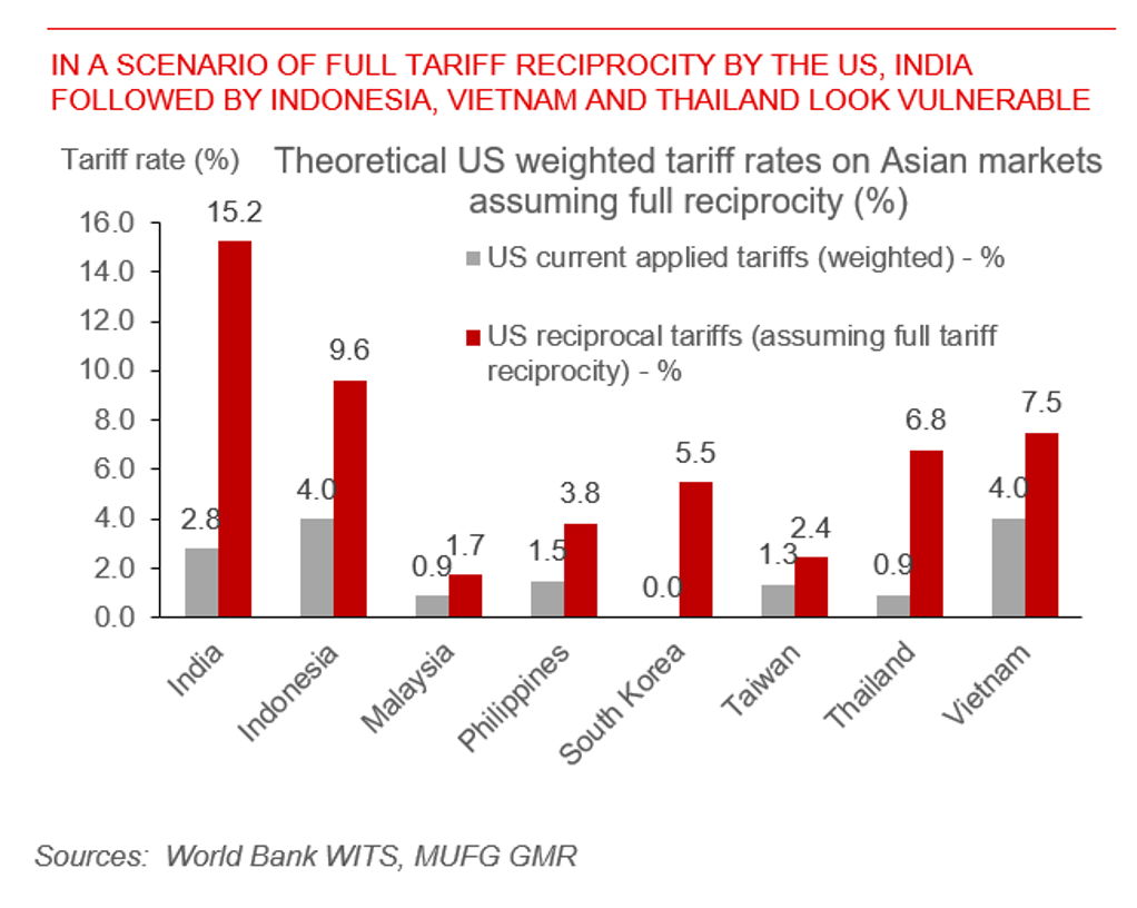 In a scenario of full tariff reciprocity by the US, India followed by Indonesia, Vietnam and Thailand look vulnerable