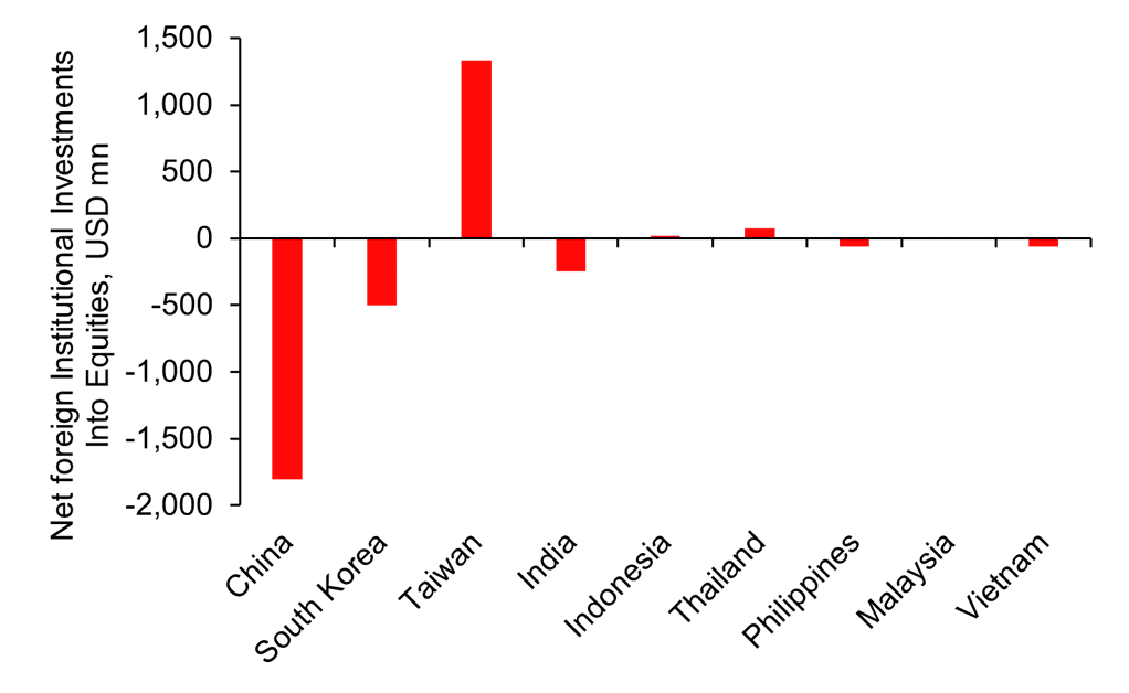 FOREIGN INVESTORS SOLD SHARES IN ASIAN EQUITY MARKETS LAST WEEK, BUT TAIWAN AND THAILAND SAW INFLOWS
