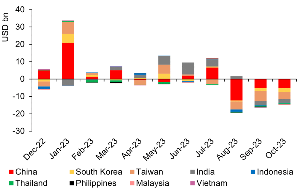NET FOREIGN SELLING OF ASIAN EQUITIES IN PAST 3 MONTHS