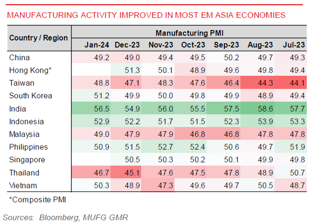 Week in review: Chinese authorities committed to further support the economy, including through fiscal support. Latest China PMIs implied an improving growth momentum in January despite that manufacturing sector remained in contraction. Outside of China, 4Q GDP growth surprised on the upside in both Taiwan and Philippines, while we are seeing improvement of exports out of countries including South Korea and Vietnam, and improvements of exports in the tech and semiconductor. January manufacturing PMIs improved for most Asian economy.