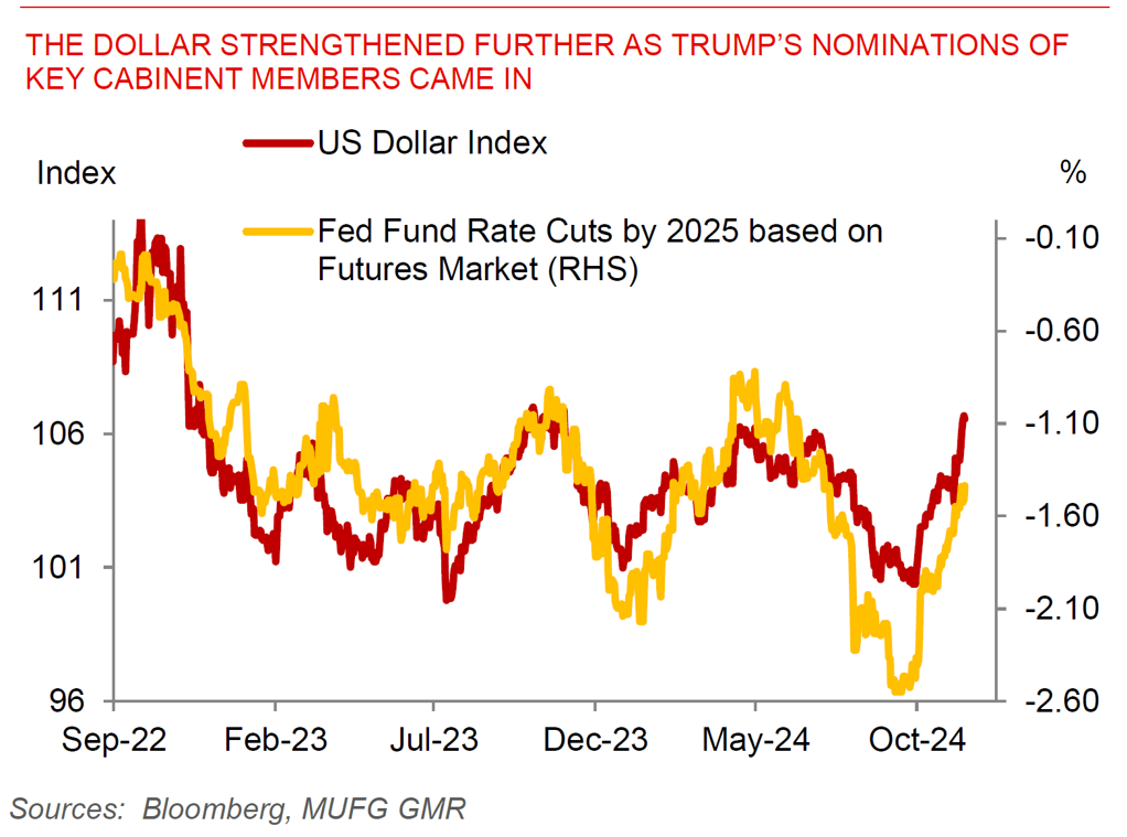 This past week has been characterised by the fast and furious nominations of Trump’s cabinet members as his team starts to assemble and take shape. The key message for markets from the various appointments is a clear hawkish stance on China and foreign policy, together with a clear focus to deliver on stricter immigration policies. In addition, while the key positions with regards to tariffs of Treasury Secretary and Commerce Secretary have not been decided yet, it is very likely that Robert Lighthizer will have an important role to play and as such the focus on pushing through tariffs with spillover impacts to China and Asia will very much be there.
