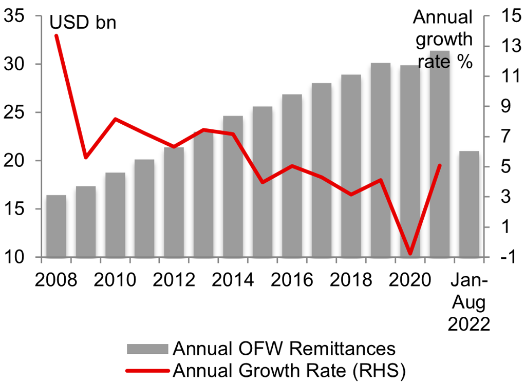 Diokno’s vow to prevent USD/PHP from breaching 60.00 is a strong signal of that level being the line in the sand for authorities. USD inflows from the seasonal increase in remittances in the coming months with the peak expected in December amid the Christmas holidays may help alleviate the pressure for aggressive intervention. But whether this can help USD/PHP stave off 60.00 remains unlikely, particularly in view of USD strength amid rising market expectations of aggressive Fed policy tightening, and no change in the fundamental factors, namely widening trade and current account deficits, that will drive the PHP weaker. We continue to expect the trade deficit to continue to widen in the coming months as external demand wanes amid slower growth in the US, China and Japan, which are the Philippines’ top three export destinations. Further, import costs are likely to remain elevated, on top of higher demand for capital goods as the Marcos administration pushes its massive infrastructure spending programme. We are keeping our end-2022 USD/PHP forecast at 61.00.