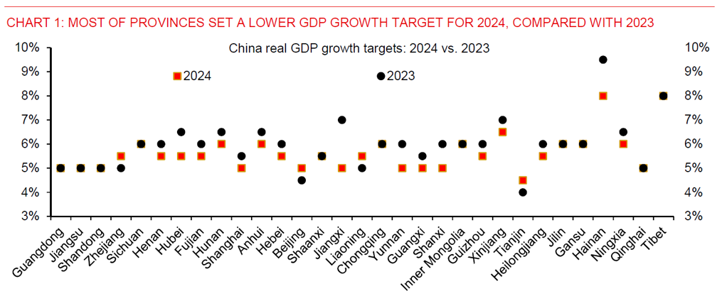 Having said it, “around 5%” is a bit inconsistent from the broad-based downward revisions of growth targets by the local governments in prior local NPCs. Chart 1 shows that many provinces set a lower growth target for 2024, compared with 2023. In fact, the bottom-up national GDP growth target, based on GDP-weighted individual province’s GDP growth target, is about 5.35% for 2024, lower than last year’s 5.6%. Historically, the bottom-up national GDP target numbers often were 0.6ppts higher than the official national GDP growth target.