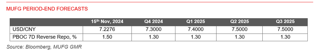 - In near term, USD/CNY will be driven by several factors, namely Trump trade, US Dollar and China’s further incremental fiscal & monetary & property policies, while for medium-term, US’s potential large tariff increase on China products would be a more impactful factor on the movement of the pair. Our forecasts price in a 20ppts increase of US’s average tariff on China products, from current 19% to 40% during next couple quarters. We expect the USD/CNY pair to grind higher and reach 7.30 by year-end and 7.50 by Q3 2025 (Link).