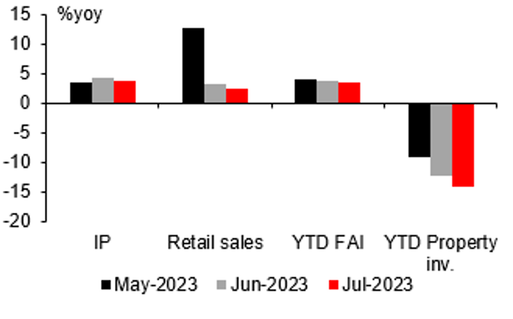 - July key macro numbers surprised market to the downside. Both year-over-year and month-on-month changes of indicators including IP, FAI, retail sales and property indicators, decelerated. In fact, retail sales, FAI and property sector’s main activity indicators contracted sequentially in July.