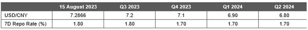 - We still expect USD/CNY to strengthen by the end of this year on improving economic fundamental and sentiment. However, due to our downward revisions on China’s real GDP growths, recently widened negative yield spread between China and US bonds, and potential more gradual pace of narrowing of the negative yield spread compared with our prior views, we expect USD/CNY to reach 7.1 by the end of 2023, up from prior forecast of 6.8 for the end of 2023.