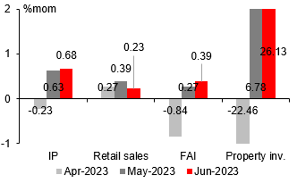 - June data improved marginally as well, consistent with previously released June PMIs. June numbers showed that the intrinsic domestic demand was weak as well: although all major macro indicators expanded in June, a slower pace of retail sales expansion was recorded for June; the mild expansion of IP was largely driven by mid- and upper- stream industries rather than down-stream industries, raising concerns on the sustainability of the expansion; while FAI improved on both YTD year-over-year and sequential growth terms, private FAI YTD contracted by 0.2%yoy in June, reflecting the lack of confidence in economic prospects by private sector.