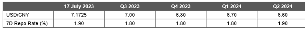 - The PBOC has been persistently setting lower-than-expected daily midpoint USD/CNY fixing to remove the one sided bet on further CNY depreciation against the dollar. While the yuan will likely continue to be supported by PBOC’s engagement via fixing, other factors like negative yield spread between China and the US likely will push CNY to the opposite direction. For CNY to engage a trend appreciation in H2, sizable stimulus packages are needed to ensure a stable positive sentiment towards China’s growth and assets, and actual pick-up in growth momentum. In short, we expect a still volatile USD/CNY in near term with a bearish bias, and expect USD/CNY to reach 7.0 by the Q3, 2023.