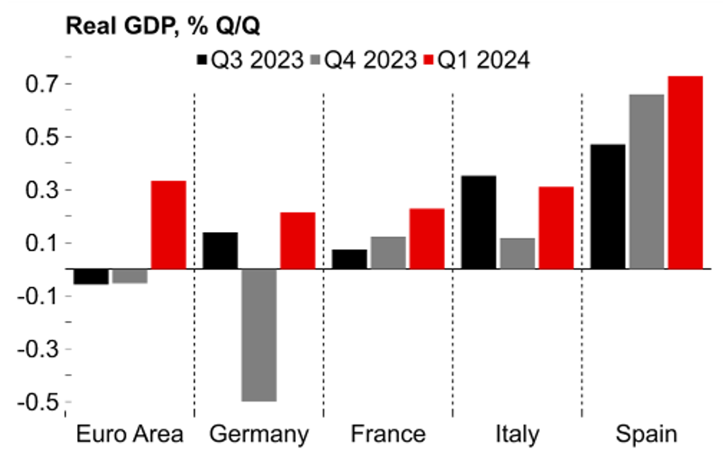 The fading of the negative energy price shock in Europe appears to be bringing an end to the period of economic stagnation that has been in place since the end of 2022. The release yesterday of the latest GDP report from the euro-zone revealed that economic growth picked up more strongly than expected by 0.3% in Q1. It was the strongest quarterly growth since Q3 2022. Our European economist believes these Q1 GDP figures could be an inflation point for the euro-zone (click here) with stronger growth likely to continue through the rest of this year. The improving cyclical outlook for the euro-zone economy is one reason why the ER/USD has proven more resilient this year even as expectations for ECB and Fed policy divergence have widened.