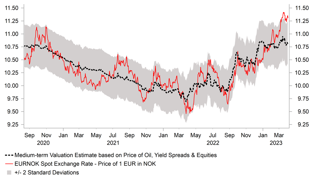 The higher price of oil should help to provide more support oil-related G10 currencies such as Canadian dollar and Norwegian krone. The Norwegian krone has been hit particularly hard this year and is by some distance the worst performing G10 currency (-6.5% vs USD YTD & -7.2% vs. EUR YTD). According to our short-term valuation model that takes into account the price of oil, yields spreads and equity performance, the krone became significantly undervalued in March. The OPEC+ announcement could provide the catalyst needed to trigger a correction higher for the krone.