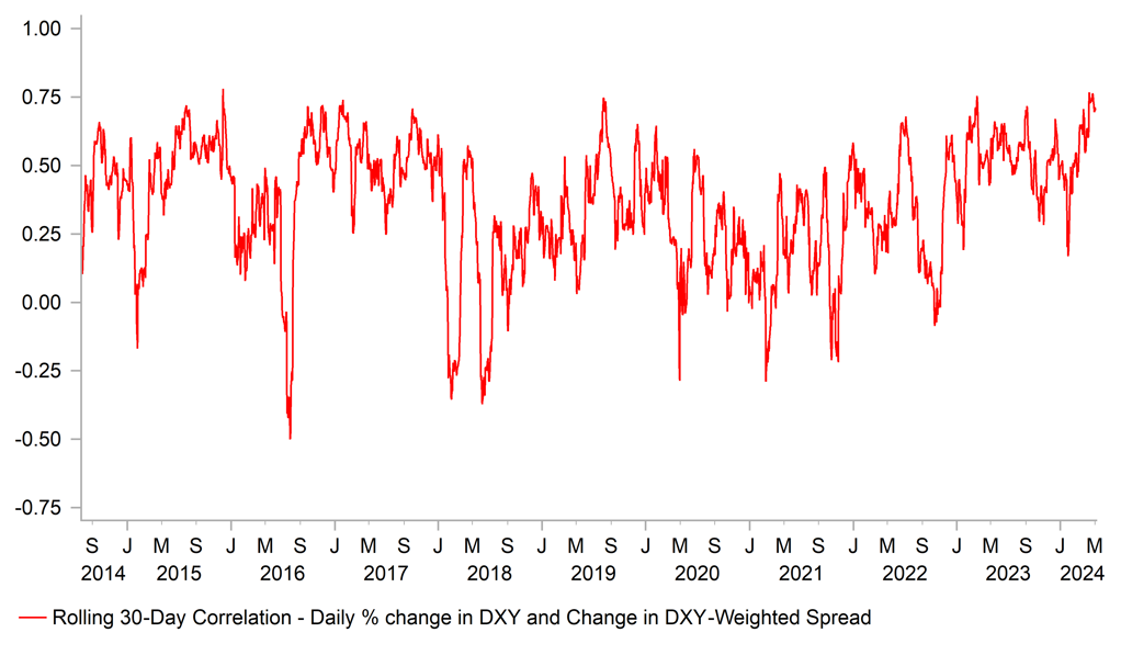 2-YEAR DXY-WEIGHTED YIELD SPREAD CHANGE AND % CHANGE IN DXY CORRELATION REMAINS CLOSE TO A RECORD HIGH