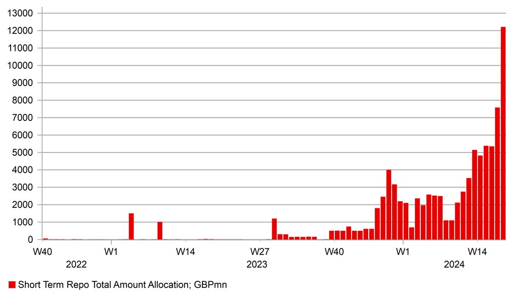 The next updated guidance on QT comes in September and if by then the MPC has cut rates and if the current signs of tight liquidity continues there may be a change considered. Certainly any complication in the transmission of monetary policy would increase pressure for QT to be tapered. In the meantime, the BoE will likely be investigating to assess why this demand for cash is surging at a time when reserves are viewed as considerably above the previously reported equilibrium level.