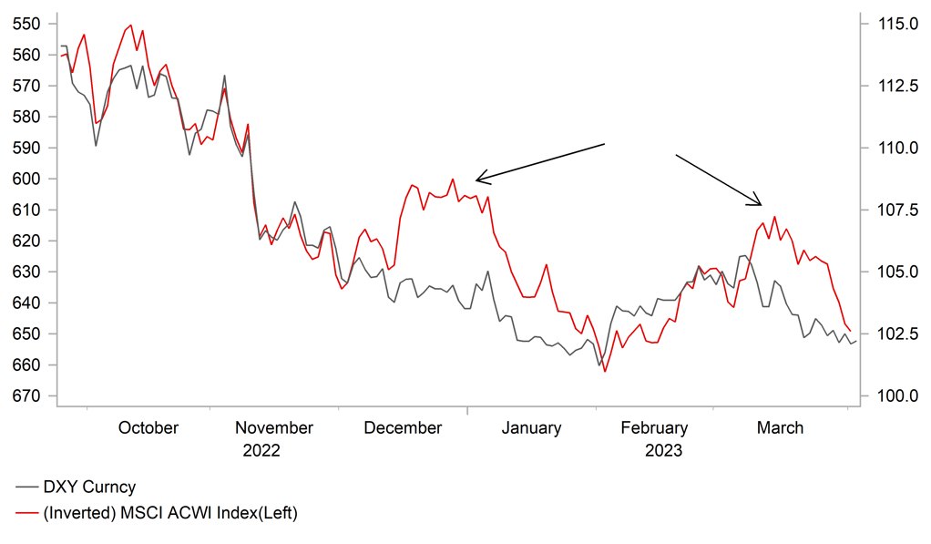 The US dollar suffered a sharp reversal lower yesterday with the dollar index falling back close to recent lows at 101.92 after hitting an intra-day high earlier in the day at 103.06. The unfavourable price action highlights that risks remain tilted more to the downside for the US dollar in the near-term. The US dollar is currently being undermined by the improvement global investor risk sentiment as fears over a bigger hit to the global economy from a systemic banking crisis have eased, while US yields continue to remain at significantly lower levels. It reflects ongoing confidence amongst market participants that the Fed will bring an earlier end to their rate hike cycle in anticipation that the expected tightening in credit conditions imposed by regional banks will help to slow the US economy and inflation. The improvement in investor risk sentiment is evident by the performance of MSCI’s ACWI global equity index that has now fully reversed last month’s sell off and is trading at its highest level since the middle of February, while the US rate market is still not fully pricing in at least one more rate hike and then almost 50bps of cuts by the end of this year.
