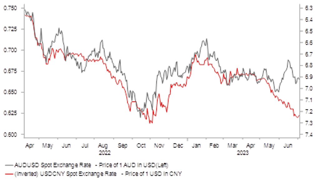 One section that remained unchanged from last month was the forward rate guidance. The RBA repeated that “some further tightening of monetary policy may be required to ensure that inflation returns to target n a reasonable time frame, but that will depend upon how the economy and inflation evolve”. It signals that the RBA are planning to deliver at least one more 25ps rate hike this year. The RBA added that they will pay close attention to the “forecasts” for inflation and the labour market. After today’s policy update the Australian rate market has scaled back expectations for further policy tightening from the RBA. There are currently around 10bps of hikes priced in the for next policy meeting on 1st August and 34bps hikes by the end of this year. The Australian rate market has become less confident over whether the RBA will deliver more than one more hikes in this cycle. It will put a dampener on the performance of the Australian dollar in the near-term alongside the recent loss of growth momentum in China’s economy in Q2. Domestic policymakers in China are expected to roll out further stimulus measures this month that will be important in determining whether confidence continues to deteriorate in China’s economy.