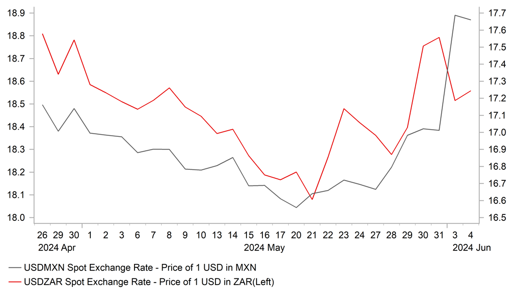 Political risk has returned as an important driver of emerging market currency performance over the past week. The results from elections in South Africa, Mexico and India have all created more political uncertainty that has contributed to weaker domestic currencies. The South African rand was hit first at the start of this week after it was revealed that the ruling ANC party lost their majority in parliament after securing just 40.2% of the votes, and are now in the process of trying to form a coalition government. Under the constitution, South Africa’s Assembly must convene within 14 days to elect a speaker and a president after the declaration of the election outcome. The initial rand sell-off briefly lifted USD/ZAR back above the 200-day moving average at around 18.800 although it has since fallen back towards the 18.500-level. The rand staged a strong rebound yesterday after it was revealed that both the ANC and the main pro-business opposition party the Democratic Alliance are open to forming a coalition government. An alliance with the DA would be welcomed by market participants as it could open the door to accelerated economic reforms and privatization initiatives in South Africa. However, the worst-case outcome represented by a coalition between the ANC and the leftist parties can’t be ruled out yet either. An outcome that would pose significant downside risks for the rand. Former president Zuma’s uMkhonto weSizwe party is though demanding that Ramaphosa would need to be replaced as president to join a coalition with the ANC making it a less palatable option.