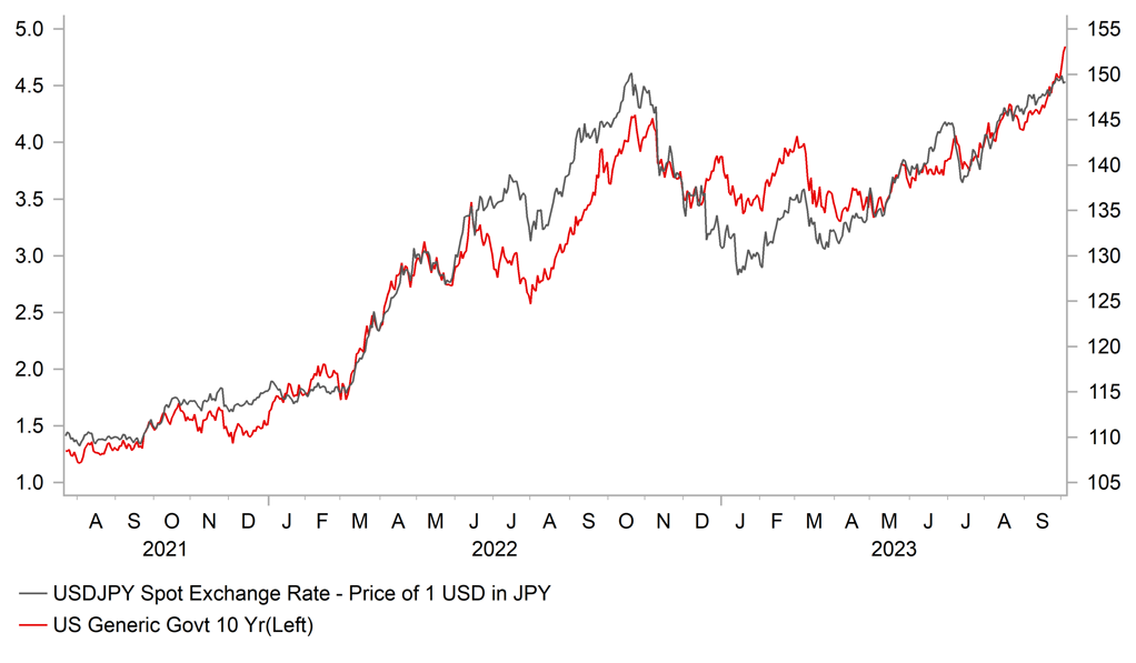 However, it is not yet evident that the sell-off in the US Treasury market has reached a crescendo on this occasion. The 10-year US Treasury yield has continued to surge higher this week hitting a new cyclical high overnight of 4.86%. It has now increased sharply by around 80bps in just over a month with the pace of the move higher in US yields picking up at the start of October. It has been encouraged in recent days by more evidence that the US economy is proving resilient, although the moves appear somewhat exaggerated relative to the importance of the economic data flow. The latest JOLTS report revealed that job openings rebounded to 9.61 million in August. It was the first increase in job openings after three consecutive months of declines. The underlying trends from the JOLTS report are still that the rate of job openings, hiring and quits are all slowing and point to weakening labour demand and less pressure on wage growth. Nevertheless, the US rate market has been moving to price in a slightly higher probability of one final Fed hike later this year which currently stands at around a 50:50 probability. The release of the non-farm payrolls report on Friday should prove more important in determining whether the US bond market sell-off and US dollar rally extends further in the near-term. Japanese officials will be hoping for a weaker report to ease upward pressure on USD/JPY.