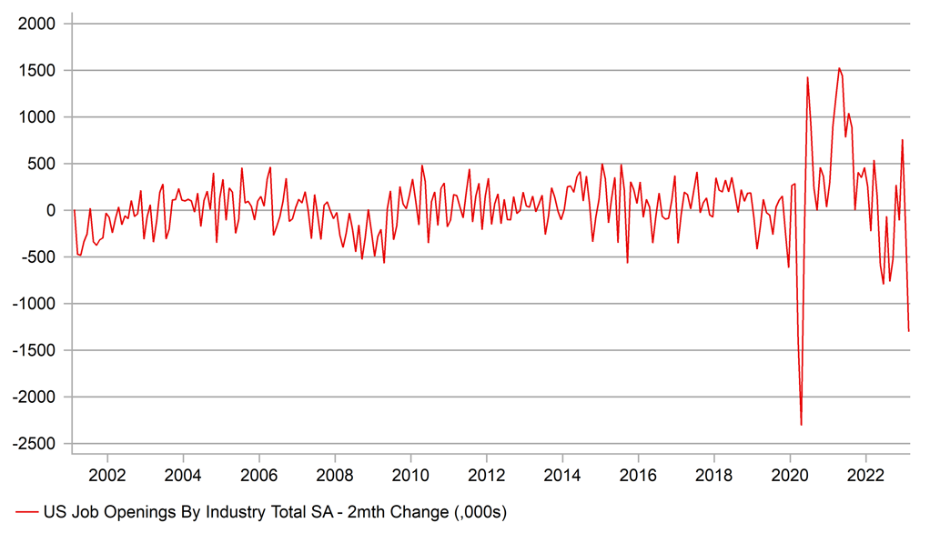 Each day brings more data that suggests the US economy could be weakening more abruptly than assumed only recently. The ISM Manufacturing Index revealed on Monday that every sub-index was below the 50-level and this was followed yesterday by the JOLTS data that revealed a 632k drop in job openings in February. It was the second consecutive large drop – indeed the 2mth decline in job openings of 1.3mn was the largest on record when the labour market turmoil during covid is excluded. With the ISM Manufacturing Employment Index down at 46.9, there is growing evidence that the positive demand in the US labour market is now beginning to fade. If that is confirmed on Friday by a weaker than expected non-farm payrolls report it will likely result in a more substantial depreciation of the dollar.