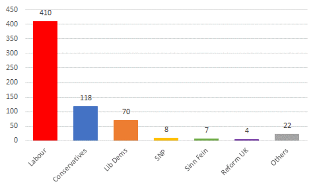 The Labour Party is heading for an unprecedented victory in the UK general election and is looking like it will exceed the exit poll prediction of gaining an overall majority of 170, winning more than the 410 seats predicted last night. Labour is now predicted to end with 415 seats. The Conservative Party has lost a staggering 247 seats at the time of writing with Labour winning 210 seats and is projected to end with 120 seats. The Liberal Democrats won 70 seats for a gain of 62. Last night’s exit poll predicted Reform UK winning 13 seats but that was an over-estimate with Reform UK on 4 seats. Still in terms of the share of the vote, Reform UK has done huge damage to the Tories by gaining 14.3% of the vote share. The latest projected parliamentary majority is now looking closer to 180 seats.