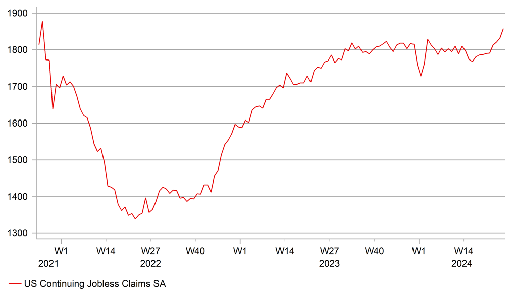 In this context we would certainly argue that there are greater downside risks to the non-farm payrolls consensus of +190k. A downside surprise certainly less than 150k would likely see a more significant rates move lower and with it greater conviction for a rate cut in September. 18bps of cuts are now priced for September and that could quickly be close to fully priced on a weaker report. The FOMC communications remain mixed but certainly we would argue not entirely consistent with the current median dot of just one rate cut this year and there appears to be a growing expectation that weaker labour demand will now see a clearer pick-up in the unemployment rate.