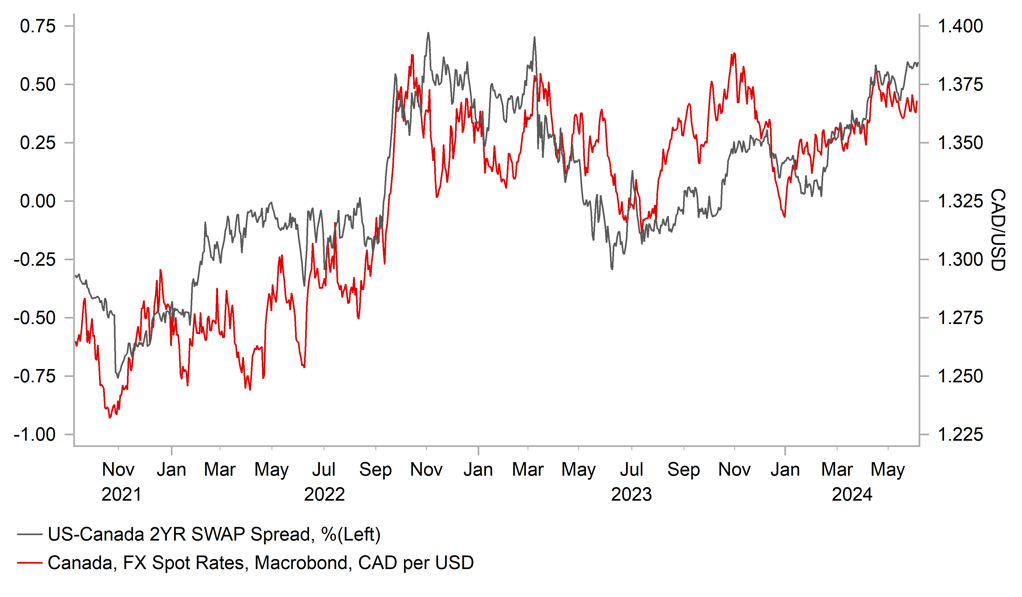 2-YEAR US-CA SWAP SPREAD VERSUS USD/CAD