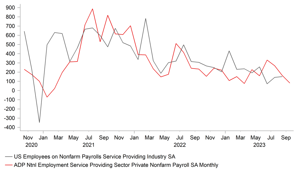 It was another volatile trading session yesterday in the foreign exchange market which continues to be driven by spill-overs from the US bond market. After hitting an intra-day high of 4.88% yesterday, the 10-year US Treasury bond yield has since fallen back to an intra-day low overnight of 4.70%. The pullback in US yields has resulted in a reversal of recent US dollar strength. The dollar index has fallen by around -0.8% from the high at the end of last week resulting in EUR/USD moving back above the 1.0500-level and USD/JPY falling back closer to the 148.00-level. The correction lower for US yields has been encouraged by the release of softer US economic data but more importantly could be an indication that the trends are starting to lose upward momentum. Technical momentum indicators are signalling that 10-year US Treasury yield is the most overbought since September of last year just prior to the peak in October. The two main economic data releases that have brought some temporary relief for the US bond market have been the ADP and ISM services surveys for September. The ADP survey has estimated that private sector jobs growth likely slowed further to 89k in September. The breakdown revealed that service sector job growth slowed to 81k. While the ADP survey is not always the most reliable leading indicator of employment growth in the non-farm payrolls report, it did prove to be an accurate indicator for the last NFP report for August (ADP for August at 177k vs. NFP private at 179k) which may encourage market participants to place more weight on the importance of the ADP reading ahead of the release of the next NFP report on Friday. The ADP survey does fit with other indicators pointing towards a continuing slowdown in labour demand as employment growth is moving back to more normal levels prior to COVID.