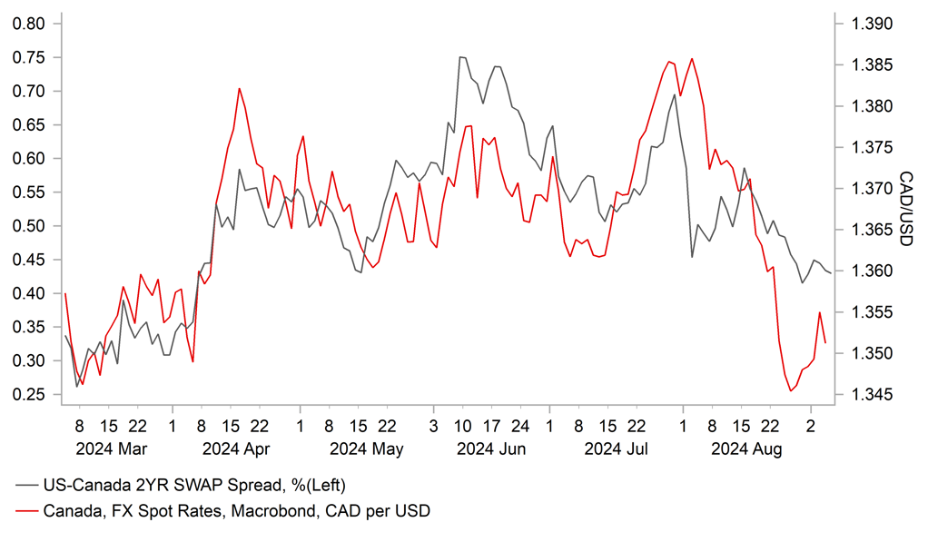 The broad-based US dollar sell-off yesterday triggered by the weaker US JOLTs report helped to lower USD/CAD back towards the 1.3500-level even after the BoC lowered their policy rate for the third consecutive meeting by 25bps to 4.25%. USD/CAD has corrected lower over the past month after hitting a high of 1.3946 on 5th August. The recent correction lower for USD/CAD has been encouraged by a narrowing of expectations for policy divergence between the BoC and the Fed. While the BoC has led the way in the current easing cycle, the Fed is now expected to follow their lead by beginning to cut rates this month. Based on recent moves in short-term yield spreads alone, it appears that USD/CAD recently overshot to the downside when it fell to a low of 1.3441 at the end of August.