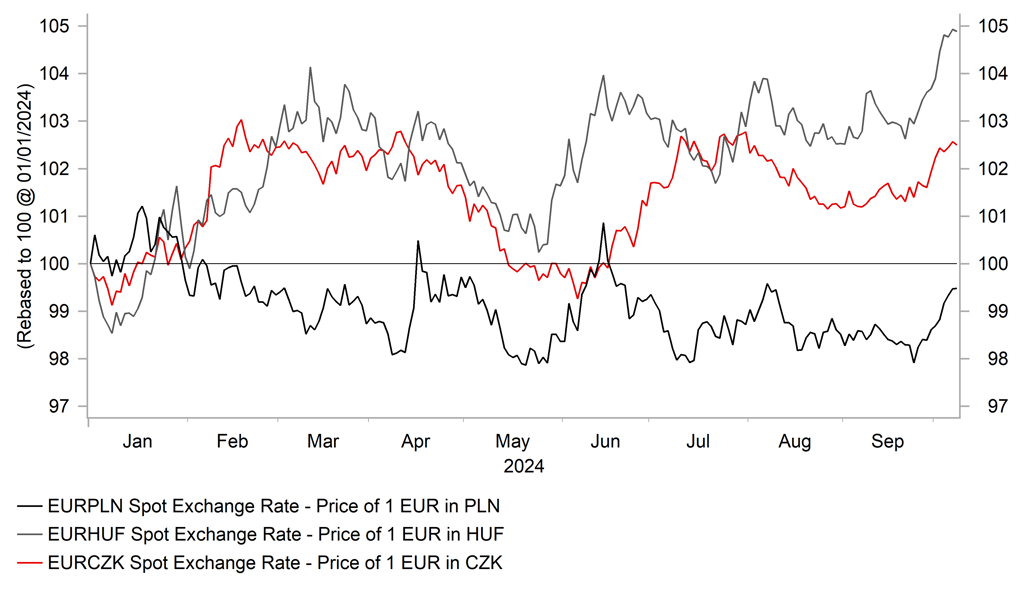 At the same time, the USD has benefitted from recent dovish signals from central banks outside of the US. The economic recovery in Europe has lost upward momentum in the 2H of this year and inflation has continued to slow encouraging regional central banks to signal more willingness to cut rates including the ECB and BoE. The negative regional developments and higher energy prices have weighed on Central European currencies helping to lift EUR/CZK further above the 25.000-level, EUR/HUF back above the 400.00-level and EUR/PLN back above the 4.3000-level. The release of the latest CPI reports for September from the Czech Republic and Hungary will be in focus in the week ahead. The PLN sell-off has been encouraged by more dovish comments by NBP Governor Glapinski who opened up the door to rate cuts as soon as March or earlier. The NBP has been reluctant to cut rates again since last year’s election. Please see our latest EM EMEA Weekly for more details (click here).
