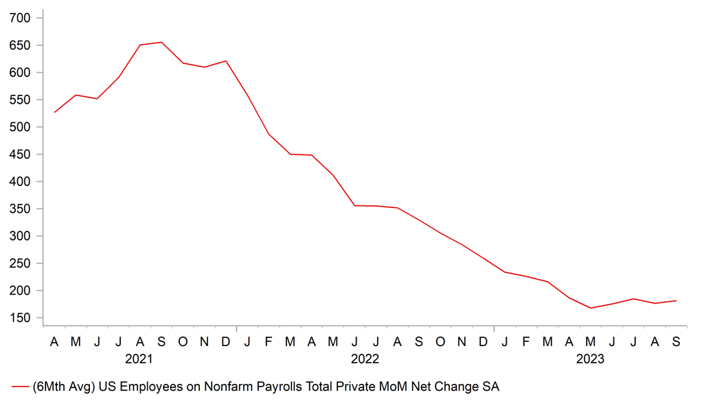 The release of the non-farm payrolls report for September revealed further evidence that the US labour market remains resilient. It is less clear now that employment growth has slowed as much this year. After including the upward revisions to prior months, employment growth has averaged 266k/month over the last three months which is roughly the same as the year to date average 260k/month. Those headline figures have been flattered somewhat by large monthly increases in government sector jobs over the last three months totalling 214k. Private sector job growth has been running at around 195k/month and 184k/month over the last three and six months on average. It compares to an average in the second half of last year of 317k/month. One part of the report that remains more reassuring for the Fed is slowing pace of average hourly earnings which increased by 0.2%M/M in September. The second consecutive softer monthly reading. Stronger employment growth though will keep alive expectations for one final hike from the Fed later this year. The next important release for the Fed ahead of 7th November FOMC meeting will be the latest US CPI report on Thursday. If the report continues to show further evidence of slowing core inflation, it will support our call for the Fed to keep rates on hold and make it harder for the US dollar to regain upward momentum in the week ahead.