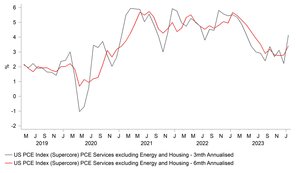 The sudden jump for the US dollar in London afternoon trading yesterday looked suspiciously like month-end related dollar demand with no obvious catalyst for the move. The DXY index advanced 0.5% in the period around the London fix and much of that gain remains intact today with euro-zone inflation in focus after yesterday’s PCE data in the US. The PCE data as expected highlighted a rebound which was well telegraphed and the fact that there was no upside surprise on top of the expected acceleration helped provide some relief to the markets. The “supercore” PCE was certainly alarming with a jump of 0.6% m/m, the biggest gain since December 2021. Financial services & insurance accounted for the largest part of that increase, at about one-third of the total increase and is a reflection of the strength of equity markets.