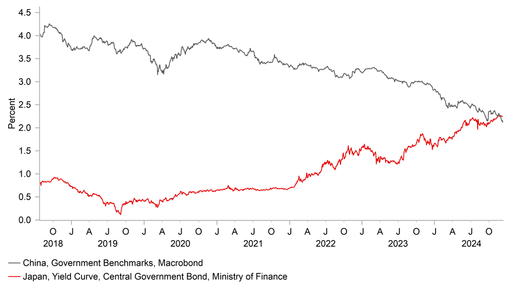 LONG-TERM YIELDS IN CHINA FALL BELOW THOSE IN JAPAN