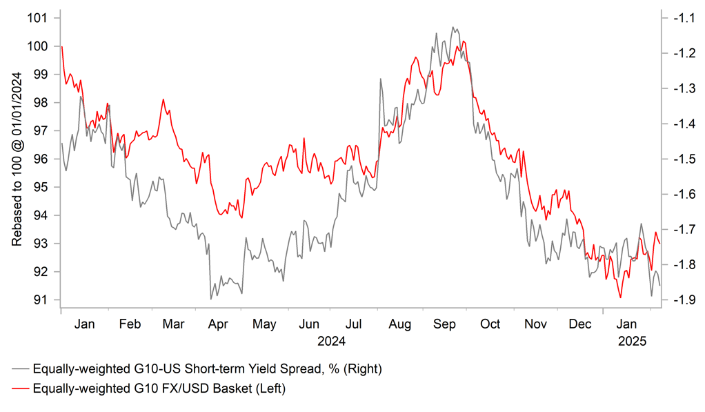 The US dollar’s upward momentum has been supported as well by further evidence that the US labour market remains strong. It will encourage the Fed to leave rates on hold for longer at the start of this year and makes another rate cut as soon as the next FOMC meeting in March even less likely. The US rate market is currently pricing in only around 2bps of cuts for March and does not expect the next rate cut until the middle of this year. In contrast other major central banks of the BoE, ECB and PBoC are expected to continue lowering rates further at the start of this year opening up a wider policy divergence with the Fed, and encouraging a stronger US dollar. The nonfarm payrolls report revealed that the US economy added 143k jobs in January following upwardly revised jobs gains of 307k in December and 261k in November. As a result the average number of job gains since the US election has picked up to 237k in January from 118k in the three months to October. The Fed will also be reassured that the unemployment rate ticked lower by 0.1 point tot 4.0%, and has been consolidating since the middle of last year. Overall, the report does not provide justification for the Fed to consider cutting rates sooner. A view we expect to be expressed by Fed Chair Powell at this week’s semi-annual testimony on monetary policy. Inflation would have to slow further at the start of this year to encourage the Fed to continue cutting rates two more times as planned.
