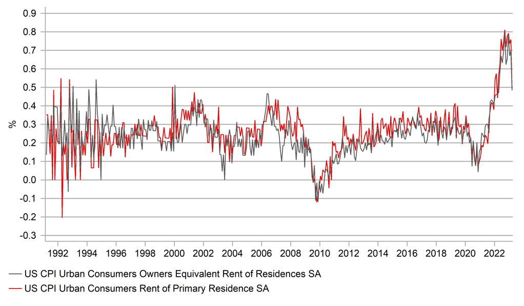 A big element that is a little more difficult to predict is the pace of MoM change in rents. The rent of primary residence and OER have both slowed to 0.5% MoM, the slowest rates since March/April 2022 and if that rate is matched for primary rents, the annual rate will decelerate and would be a key potential turning point.