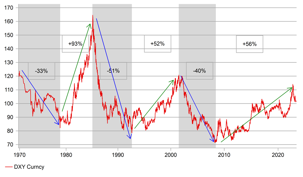 What remains clear and in need of addressing is that under current legislation, debt-to-GDP is trending higher and is therefore unsustainable. The Committee for Responsible Federal Budget estimates that under Biden’s medium-term proposals to reduce debt over the next decade by USD 3trn, the debt-to-GDP ratio rises from 98% to 110%. Under the Republican plan to reduce debt by USD 4.8trn, debt-to-GDP rises to 106%. The problems are vast even beyond the resolution of the debt-ceiling stand-off and reinforce our longer-term US dollar view that the dollar last year reached a long-term high and has now begun a period of depreciation.