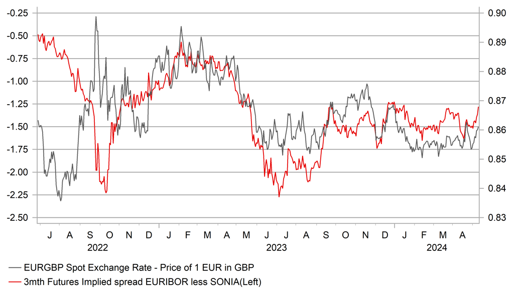 From a pure rates angle this argues for the potential of a move higher in EUR/GBP, a trade view we published in our FX Weekly last week (here). But there was a lack of conviction evident in market pricing given the MPC caution in moving toward a rate cut. That will be more the case now this morning after the UK GDP data came in a lot stronger than expected. The Q/Q gain of 0.6% was well above consensus with March alone gaining 0.4% m/m. The data underlines the benefit of declining inflation but from a BoE policy perspective we would still argue inflation and wage data will be more important in determining whether the BoE cuts in June or not. It’s worth noting a lot of the strength in Q/Q GDP growth is in the net trade component.