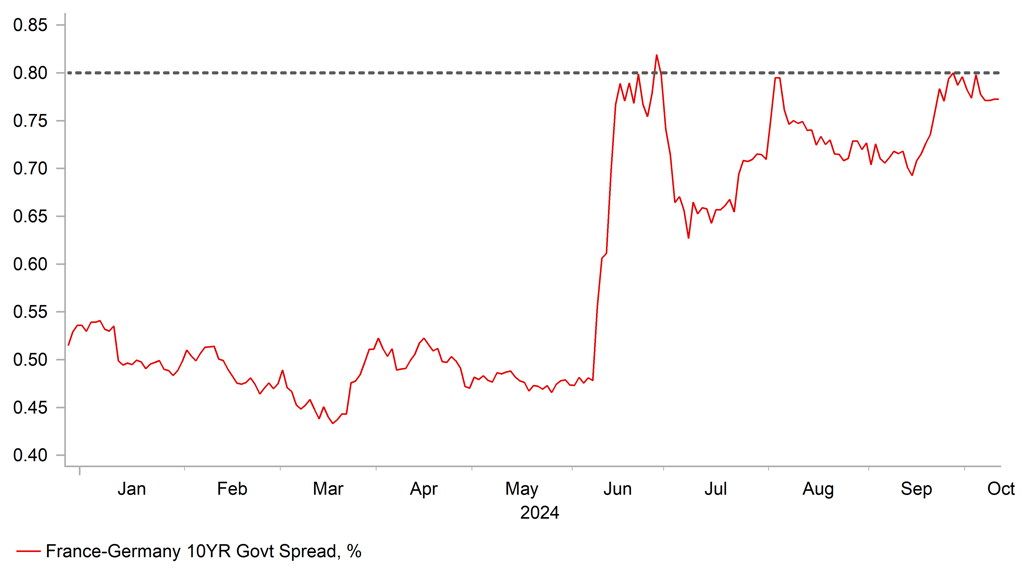 Market participants are also waiting for further budget details from the new French government. Prime Minister Michel Barnier government survived its first no-confidence motion in the National Assembly a couple of days ago. The left-win New Popular Front coalition promoted the motion of no-confidence but it received only 197 votes in favour which was well below the 289 votes required to pass. Prime Minister Barnier’s government survived primarily due to the abstention of the right-wing National Rally party. The developments suggest that the National Rally party are unlikely to vote to bring down the government while it is attempting to pass a budget for next year. Prime Minister Barnier has already outlined that they plan to bring the budget deficit down from around 6% of GDP this year to closer to 5% of GDP next year. That would require a reduction of around 1 percentage point of GDP equating to EUR30 billion. He also outlined his plan to delay bring the budget deficit back below 3% of GDP by two years out until to 2029. France must submit a fiscal plan to the European Commission by 31st October. The plan is expected to meet EU fiscal rules by bringing the deficit below 3% within the adjustment period while being consistent with the minimum adjustment of 0.5 percentage points per year. One of the main risks to the government’s plans for fiscal consolidation next year would be weaker than expected growth in France with growth of around 1% expected next year. Higher taxes could act as damper on the growth outlook. So far the fiscal developments in France have had limited negative impact on euro performance. The spread between 10-year French and German government bonds would need to significantly widen out beyond recent highs at around 80bps to weigh more on the euro. One potential banana skin at the end of this week is the Fitch’s review of France’s credit rating tomorrow. We are expecting the credit rating to be placed on negative watch but a downgrade can’t be ruled out.