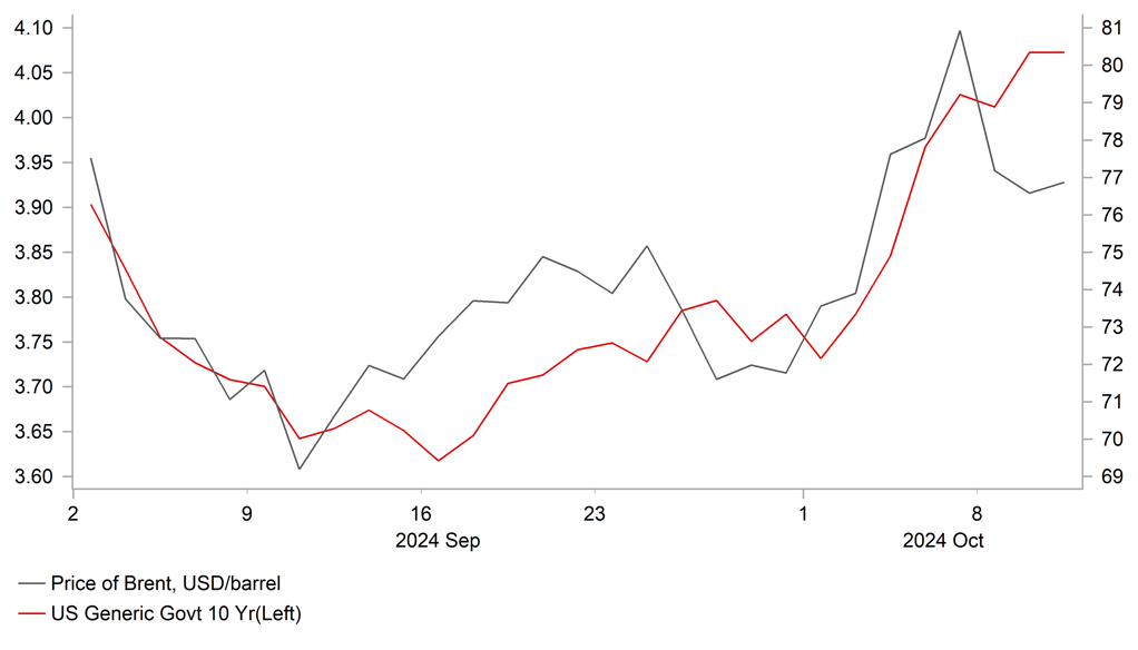 Higher yields at the long end of the US curve have also been supported recently by the pick-up in the price of oil which has lifted market-based measures of inflation expectations. The price of Brent briefly rose back above USD80/barrel earlier this week up from a low of USD69.91 at the start of October. It has since dropped back towards USD77/barrel in recent days in response to reports that Israel is planning to hit military targets in Iran rather than their nuclear facilities and/or oil production sites. The price action highlights that market participants remain nervous over the risk of a further escalation in Middle East tensions and are still waiting to assess Israel’s retaliatory response to last week’s missile attacks by Iran. Even though the price of oil has dropped back in recent days, the yield on the 10-year Treasury has continued to move higher. The price action suggests other factors are at play and could be an indication that market participants are pricing in more of a risk premium to reflect the rising probability of Donald Trump becoming the next president. According to Polymarket, the probability of Trump winning has risen up to 53.5% this week. A development that would be supportive for the US dollar as well posing upside risks for US yields.