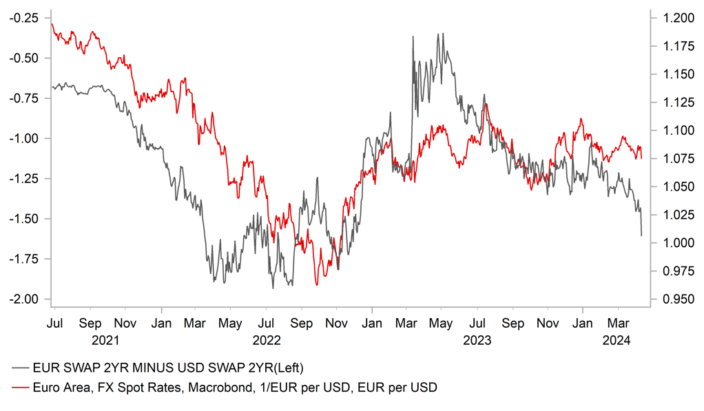 Our end-Q2 EUR/USD indicated some very moderate USD depreciation (1.0900) with a view of USD depreciation more likely in H2. If the Fed is now not going to cut in June and we get a cut from the ECB (let’s see what Lagarde says today; see below) then 1.0900 looks too high. Certainly over the very short-term (next few weeks into NFP in May), a window looks to have opened for further US dollar strength. The short-term yield jump in the US now implies EUR/USD at levels below 1.0500.