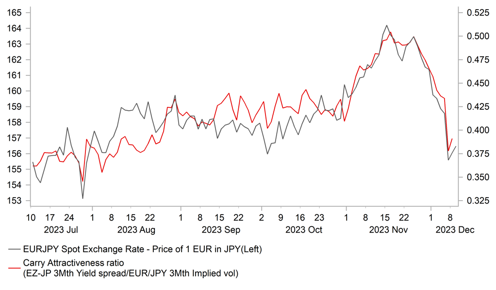 The EUR has weakened sharply since the end of last month driven primarily by the recent dovish repricing of ECB policy expectations. After EUR/USD peaked at 1.1017 on 29th November, the EUR has since been one of the three worst performing G10 currencies as it has declined by around -1.9% against the USD, -0.7% against the GBP, and -3.1% against the JPY. It has resulted in EUR/USD falling back into the middle of this year’s trading range between 1.05000 and 1.1000. While EUR/JPY has fallen back sharply towards support from the 200-day moving average at the 154.00-level. EUR/GBP has also fallen back below the 0.8600-level and moved closer to year to date lows at around the 0.8500-level.