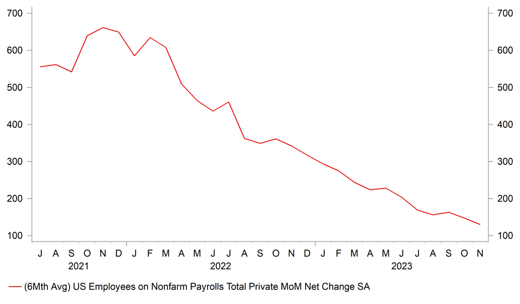 The US dollar has continued to trade at stronger levels overnight as it has extended its advance following the release of the stronger than expected US payrolls report on Friday. It has resulted in USD/JPY rising back above the 146.00-level overnight as it moves further above the low from last week of 141.70 recorded on 7th December. The rebound for USD/JPY in particular has been supported by the pick-up in US yields. The 2-year US Treasury bond yield has increased by 16bps from the intra-day low on Friday and the 10-year US Treasury bond yield by around 10bps. The stronger than expected US payrolls report has encouraged market participants to scale back expectations for Fed rate cuts in 2024. The implied yield on the December 2024 Fed fund futures contract has similarly increased by 17bps since the closing price on Thursday, and is currently pricing in around 108bps of rate cuts by the end of next year. However, the report has not significantly altered expectations over the timing of the first Fed rate cut which is still fully priced in (26bps) by the 1st May FOMC meeting.