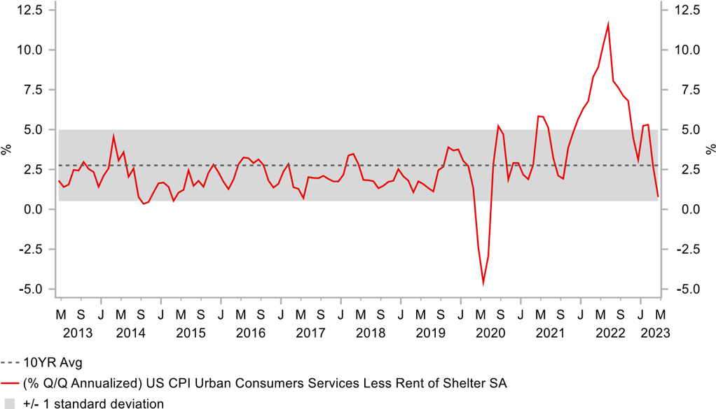of growth to 4.1% over the last six months down from a peak of 7.8% in the six months to June of last year. Prior to the COVID crisis it was running between 2-3% so it has not yet fully normalized but it should give the Fed more confidence that inflation is heading in the right direction. The Fed’s latest updated policy guidance has stressed that the upcoming policy decisions will be more data dependent. The CPI report supports our and US rate market expectations that the Fed should keep rates on hold in June. However, it was not all good news as the easing of services inflation was offset by a pick-up in goods inflation. Core goods inflation increased by 0.57% driven mainly by a big increase of 4.45% in used car prices. The good news is that auction prices dropped sharply in April so the increase in used car prices in the latest CPI report is unlikely to continue.