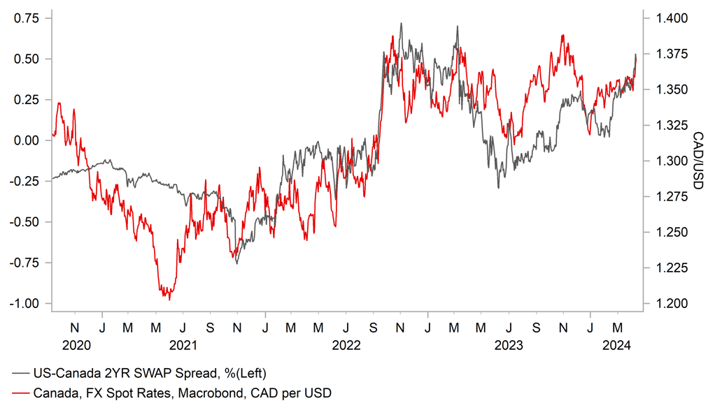 So just like with the ECB, market participants will see this window of divergence that could encourage a move higher in USD/CAD. However, the trade doesn’t look as compelling as short EUR/USD. Firstly, the FX move in CAD is much more aligned with the swap spread move (see above) which limits the scope for catch-up USD buying vs CAD unlike what could transpire in EUR/USD. Secondly, the Canadian economy is more resilient as acknowledged by the BoC’s forecasts. Finally, CAD performance is much more linked to US economic performance and overall risk and if the US economy does remain more resilient that is less negative for CAD than EUR.