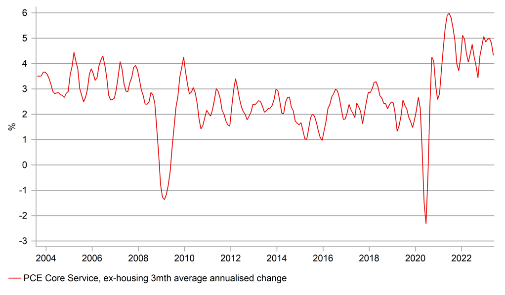 The above chart shows the 3mth annualised rate of change in the core services, ex-housing measure that the Fed have been focusing on. The 3mth annualised rate remains elevated at 4.3%, although down from 4.8% in April and a peak of 5.1% in December. Another easing today could likely take that measure back to levels last seen in September of last year and would add credibility to the view of a more sustained slowdown in underlying inflation.