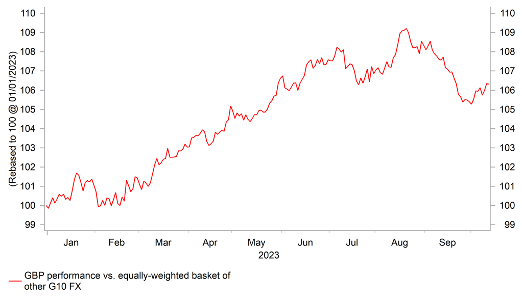 The main economic data releases early this morning have been from the UK. The latest monthly GDP report for August revealed that the UK economy returned to modest growth expanding by 0.2% following a downwardly revised contraction of -0.6% in July. After getting off to a weak start, the BoE recently downgraded their forecast for GDP growth in Q3 down from +0.4% to +0.1%. The monthly GDP report for August is unlikely on its own to trigger a further significant adjustment to their current forecast for weak growth, but risks are currently skewed to an even weaker Q3 GDP print. The breakdown of growth revealed that the service sector bounced back more strongly by 0.4% in August but it was partially offset by ongoing weakness in the manufacturing and construction sectors which continued to contract by -0.8% and -0.5% respectively in August. Weak growth alongside building evidence of slowing inflation in the UK supports our view that the BoE is unlikely to raise rates further this year with the policy rate peaking at 5.25%. It is a view that the UK rate market is becoming more confident in as well. There are currently 10bps of hikes priced in by the December MPC meeting. The sharp scaling back of BoE rate hike expectations contributed to the pound underperforming between mid-August to the end of September although it has since lost downward momentum at the start of this month.
