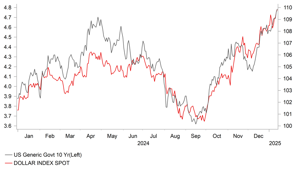 The US dollar has continued to strengthen at the start of this week lifting the dollar index to within touching distance of the 110.00-level for the first time since November 2022. The US dollar’s upward momentum has been reinforced by the release of the much stronger than expected nonfarm payrolls report for December. It has cast further doubts on the need for the Fed to keep lowering rates this year. The US rate market is now only pricing in one further 25bps rate cut from the Fed with the next cut not expected until around the middle of this year. The scaling back of Fed rate cut expectations has added to upward pressure on US yields. The 2-year US Treasury yield closed above resistance from the 200-day moving average at around 4.35% for the first time since June of last year, and the 10-year US Treasury yield hit a fresh high of 4.79%.