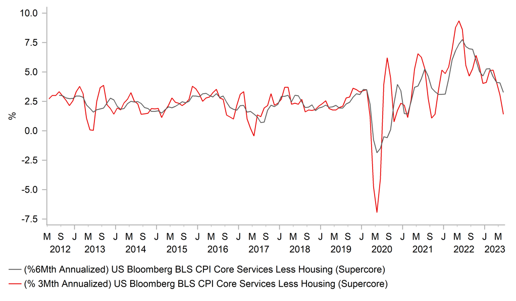 The latest CPI report revealed that the annual rate of headline inflation slowed to 3.0% in June as it moved further below last year’s peak of 9.1%. The slowdown in inflation is not just driven by lower energy and food prices, there is building evidence that underlying inflation pressures are slowing as well. The Fed has been focusing on the core services inflation measure stripping out housing costs (super core) to assess the risk of inflation persisting above their target. The good news from yesterday’s report was that the super core measure of inflation fell marginally in June by -0.004%M/M. The slowdown in super core inflation is not just a one off either, it was the third consecutive softer monthly print. The annualized rate of super core inflation has slowed to 1.4% in Q2 and 3.3% in the 1H of this year. It compares to an annualized rate of 4.7% in the 2H of last year. The developments give us more confidence that inflation will continue to slow in the coming months providing justification for the Fed to signal an end to their hiking cycle either at Jackson Hole in August or the September FOMC meeting. It is one of the key reasons why we have stuck recently to our outlook for further US dollar weakness in the 2H of this year (click here).