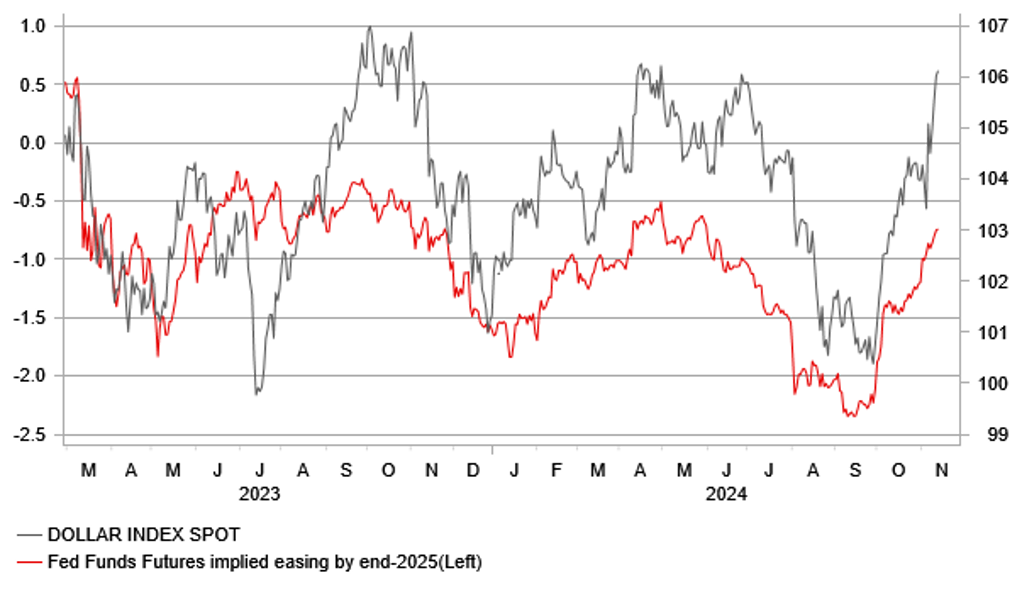 The US dollar has advanced further with momentum and technicals helping to reinforce the move on a day when there was not much in the way of macro or new political news from Florida that might have added to the strength of the dollar. The DXY on a daily closing basis broke above trend-line resistance from the highs October and November 2023 and April and June this year. All of those highs are in sight (between 106-107) and a break of those highs would take DXY to levels not seen since Q4 2022. GBP/USD was the biggest mover yesterday with GBP underperformance reinforced again from technicals with GBP/USD breaking below the 200-day moving average at 1.2819 yesterday. Overnight we have had confirmation from President-elect Trump that Elon Musk and Vivek Ramaswamy will head up a new Department of Government Efficiency (DOGE) that will focus on cutting costs and waste with Musk aiming to slash USD 2trn. Such massive cuts would fuel a sharp spike in job losses and would be deflationary but this estimate lacks credibility given government spending last year totalled USD 6.75trn. It would imply cutting all discretionary spending (which includes defense) and a portion of mandatory spending on social benefits. The job losses involved in cutting costs in government departments would likely be too much for the Trump administration to fathom. The dollar did get a lift from reported speculation that Robert Lighthizer is pushing for an aggressive start to tariffs and that an Executive Order on tariffs could be signed by Trump on day one in office.